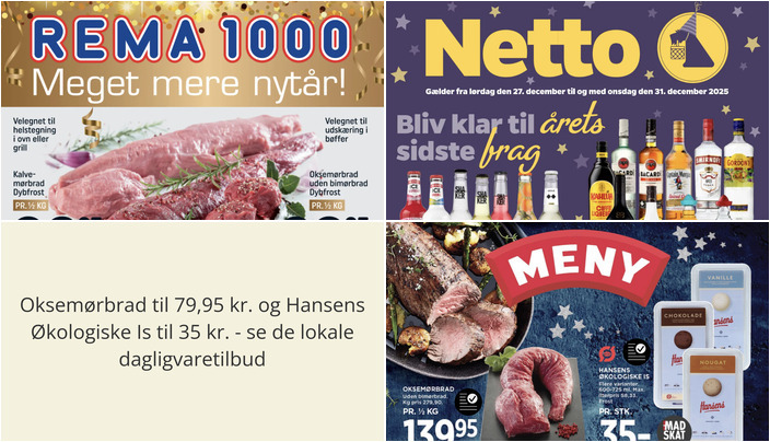 Netto tilbyder Velsmag oksemørbrad uden streng, modnet i minimum 14 dage, til en pris på 79,95 kr. pr. ½ kg. Tilbuddet gælder fra lørdag den 27. december til onsdag den 31. december.